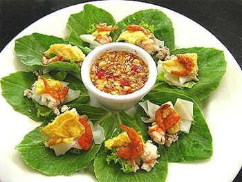 ใส่เส้นหมี่ขาว เนื้อหมู ถั่วลิสงคั่ว ขิง และหอมแดง บนผักกาดหอม ตักน้ำจิ้มใส่ พร้อมรับประทาน