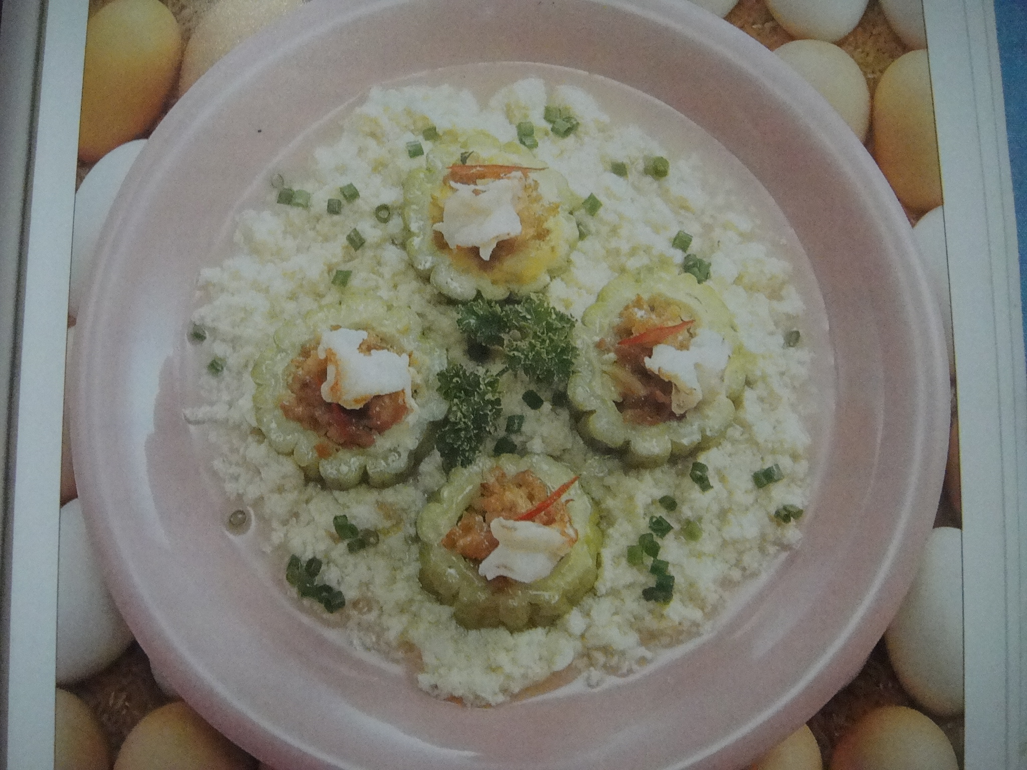2. ล้างมะระให้สะอาด ตัดเป็นท่อนให้ได้ 4 ท่อน ควักไส้ออก จัดใส่พักไว้
