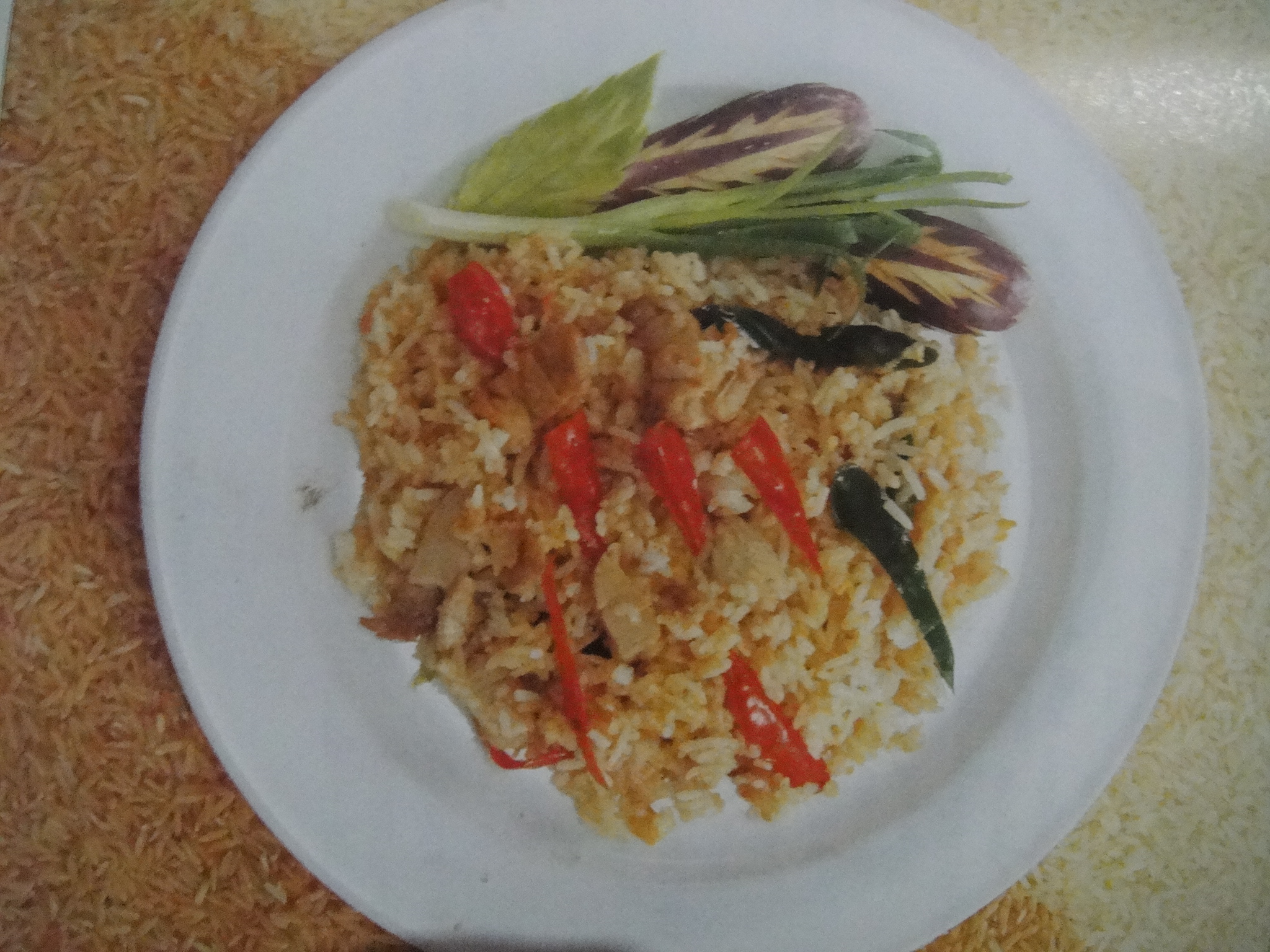 - ใส่น้ำมันลงในกระทะ ตั้งไฟให้ร้อน ใส่กระเทียม เจียวให้หอม ใส่เนื้อหมู พริกชี้ฟ้า ผัดพอเนื้อหมูสุก ใส่ข้าว ผัดพอทั่ว