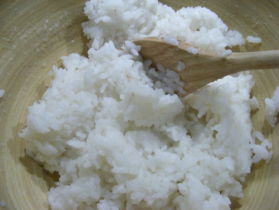 2.ช่วงที่หุงข้าวอยู่ให้ผสม น้ำส้มสายชู  เกลือ น้ำตาล ให้เข้ากัน