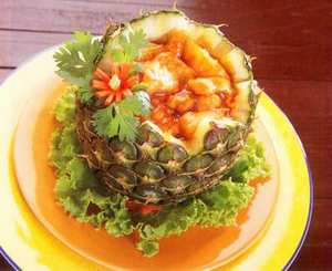 - ตัดสับปะรดตรงส่วนยอดออก เพื่อเปิดออกเป็นผอบที่มีฝาปิด คว้านเนื้อสับปะรดออก หั่นเป็นชิ้นพอคำ แต่งภายในลูกสับปะรดให้เรียบ ล้างแล้วคว่ำไว้ให้สะเด็ดน้ำ